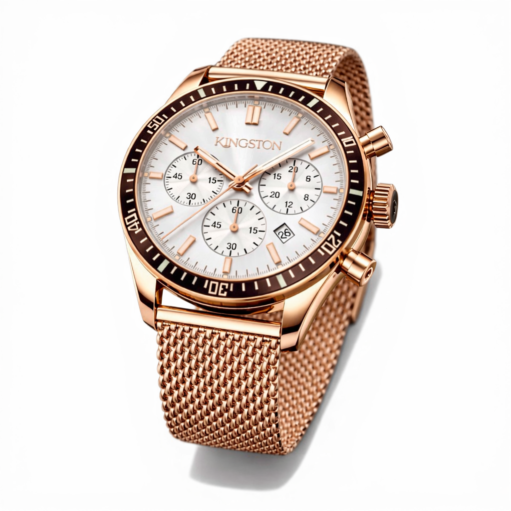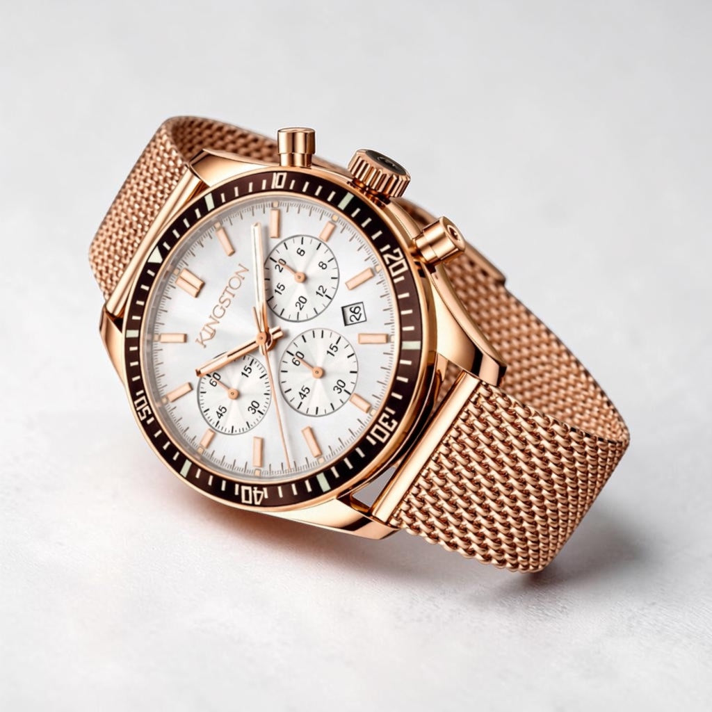 Introducing the Meridian White UNISEX Collection, where timeless design meets vibrant sophistication. A 42mm case in glossy rose gold 316L stainless steel frames a striking white dial, beautifully accented by sleek silver hands. Finished with a premium gold mesh strap, this piece exudes effortless refinement. Powered by a Japanese Miyota quartz movement with chronograph functionality and water resistance up to 3 ATM, the Meridian White delivers a perfect balance of style and precision for every occasion.