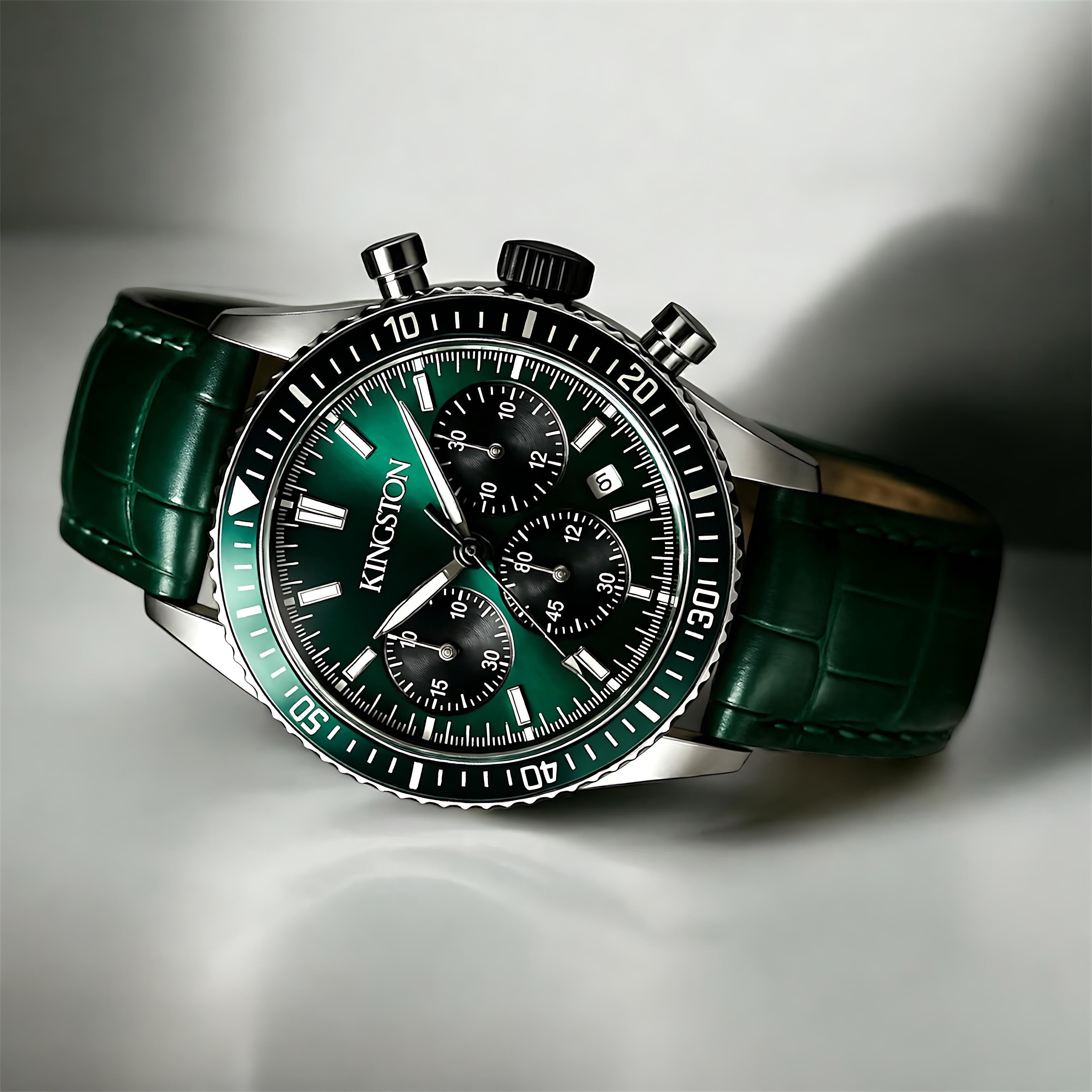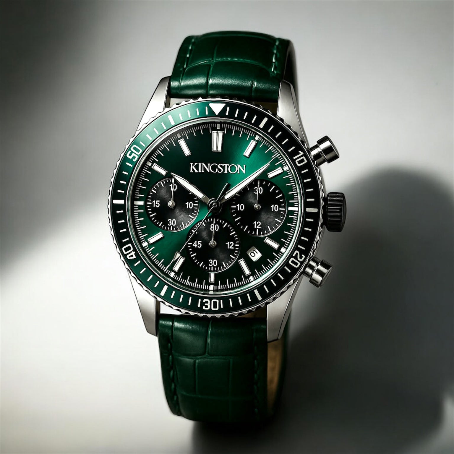 Introducing the "Windsor Pine" Collection – a fusion of green elegance. The 42mm case, crafted from 316L Stainless Steel in glossy silver, harmonises with a captivating deep green dial. Silver hands dance across the face complementing the luxurious aesthetic. The dark green leather band adds a touch of sophistication, making it a refined accessory for any occasion. With Japanese Miyota Quartz movement, chronograph functionality, and water resistance up to 3 ATM, the Windsor Pine seamlessly blends style and performance.